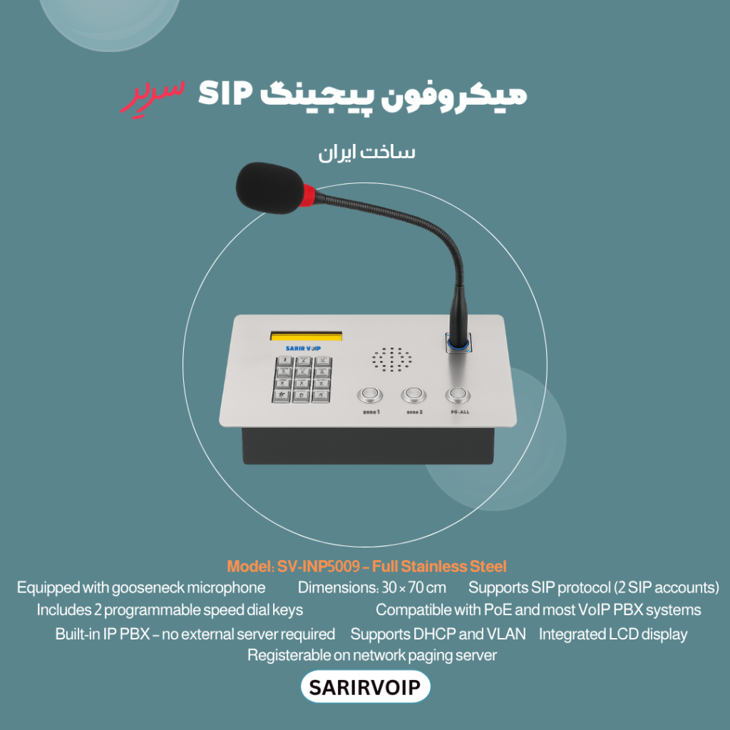 میکروفون تحت شبکه یا میکروفون SIP یکی از تجهیزات اصلی در سیستمهای پیجینگ صوتی تحت شبکه است که امکان برقراری تماس داخلی، ارسال پیامهای صوتی و مدیریت زونهای پخش صدا را بهصورت هوشمند فراهم میکند. این میکروفونها بهصورت مستقیم به شبکه IP متصل میشوند و به دلیل قابلیتهایی مانند صفحهکلید، دکمه تماس سریع (Speed Dial)، نمایشگر LCD و تعریف زونهای مختلف، برای محیطهای اداری، صنعتی، مراکز آموزشی و سازمانی انتخابی ایدهآل محسوب میشوند.